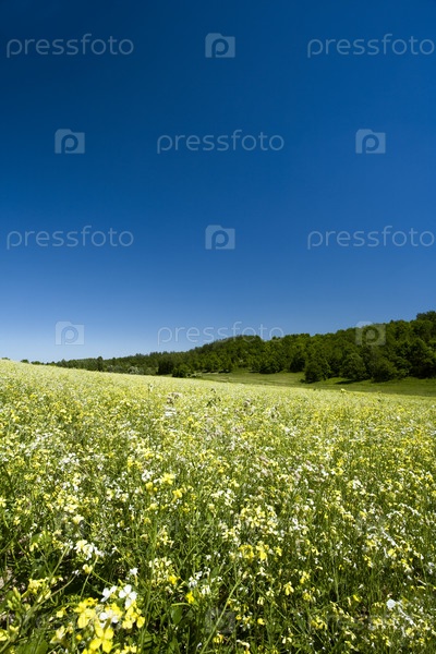 Зеленые холмы под синим небом летом
