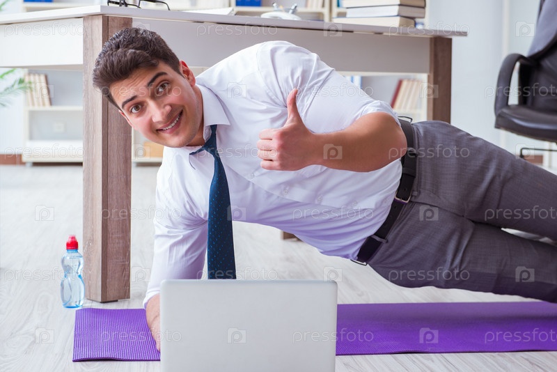 Бизнесмен занимается спортом в офисе