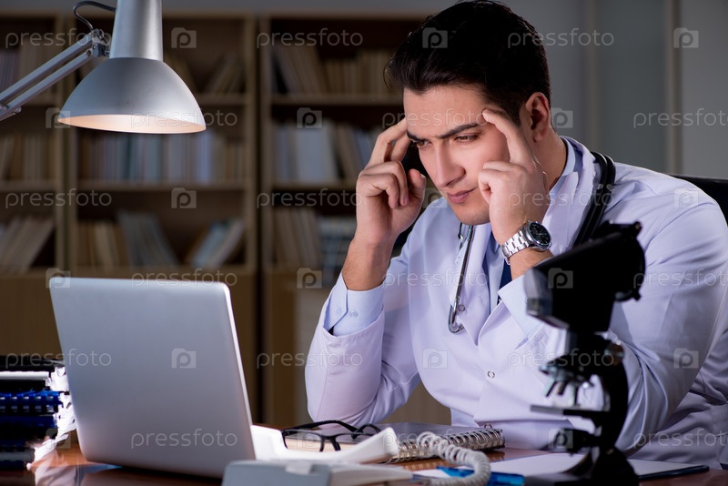 Молодой врач, работающий поздно в офисе