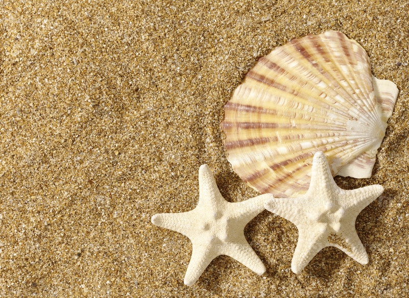 Ракушка и морские звезды на песке