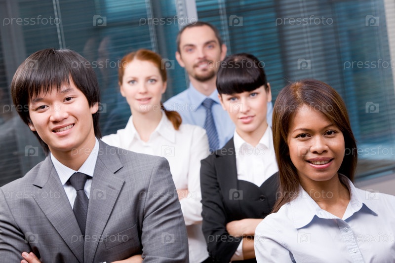 Фото успешных деловых партнеров, смотрящих на камеру с другими специалистами за ними