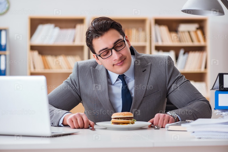 Смешной бизнесмен ест сэндвич