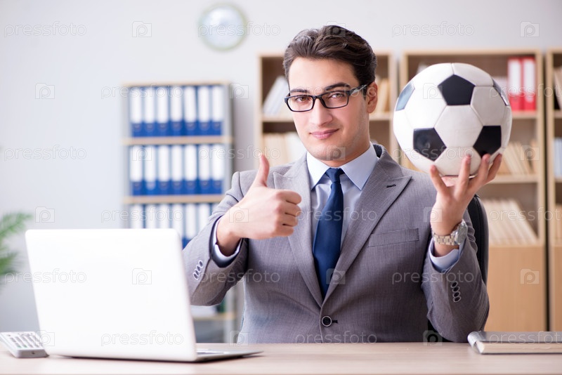 Бизнесмен с футбольным мячом в офисе