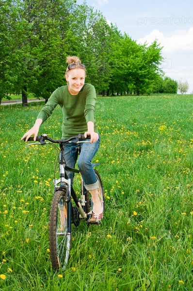 Молодая женщина едет на велосипеде по зеленому лугу