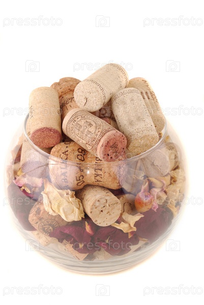Стеклянная емкость с пробками от винных бутылок и лепестками цветов