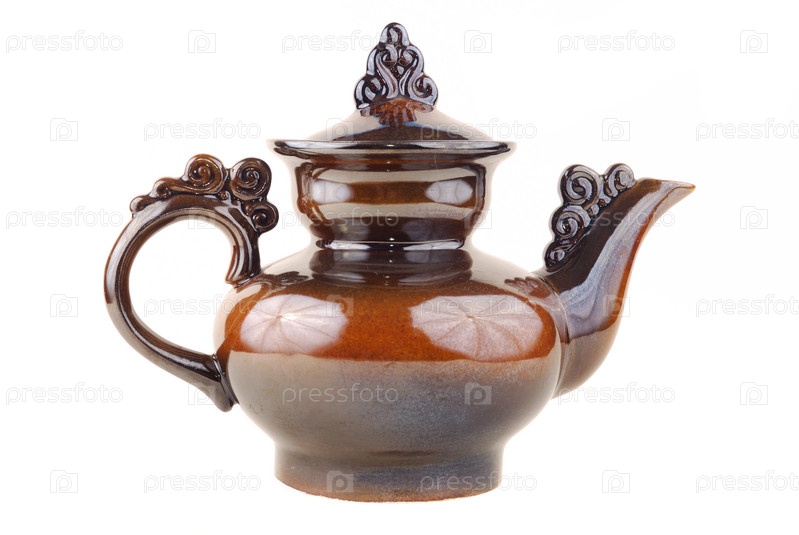Коричневый керамический чайник с узорами на ручке, носике и крышке