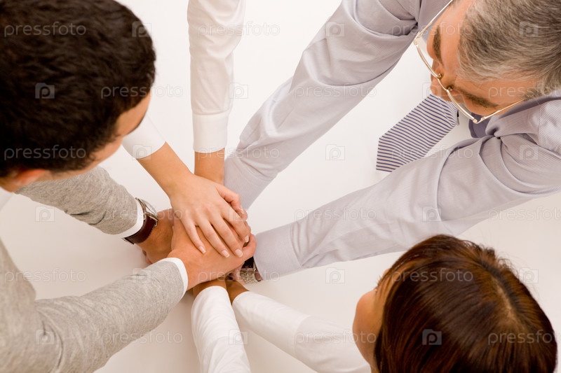 Над углом деловых партнеров, делающих кучу рук на рабочем месте