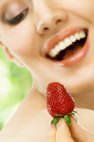 Красивая женщина наслаждается свежей клубникой