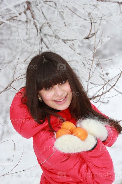 Молодая длинноволосая брюнетка с мандаринами в руках