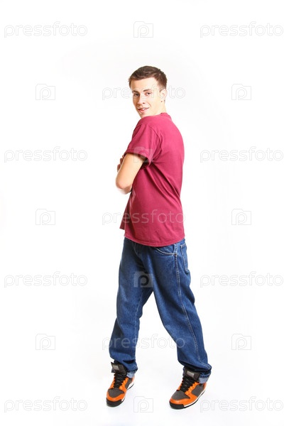 Танцор брейкданса позирует на белом фоне в студии