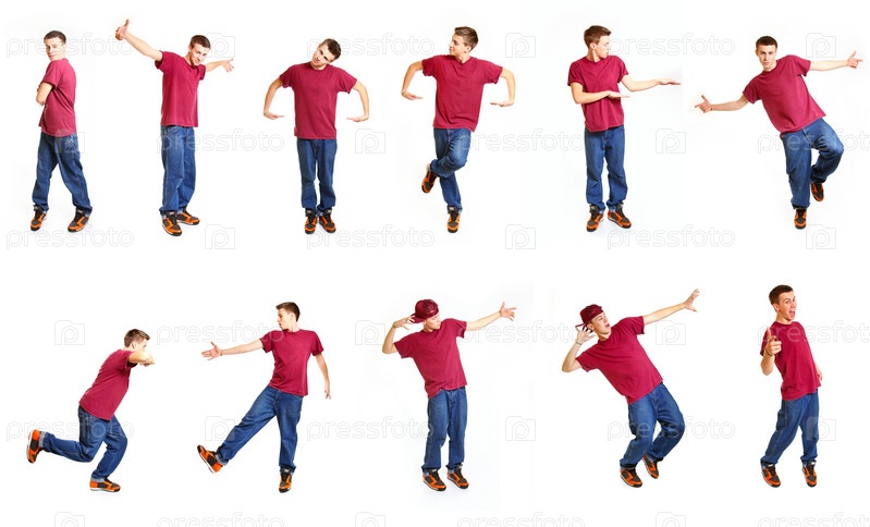 Коллаж, крутой танцор хип-хопа, изолированный на белом