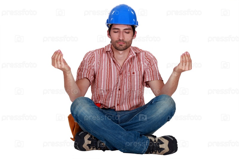 Строитель сидит в позе йога