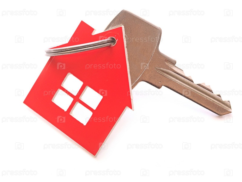 Серебристый ключ с брелоком в форме дома, изолированный на белом фоне