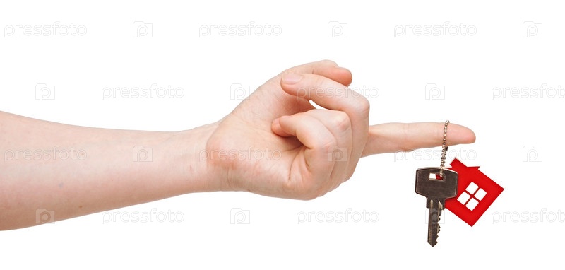 Ключ с красным домиком на цепочке в руке на белом фоне