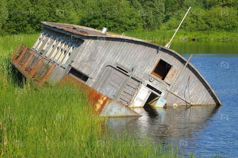 Старая поврежденная баржа в воде