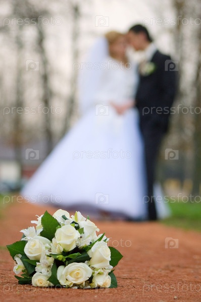 Свадебный букет на фоне жениха и невесты