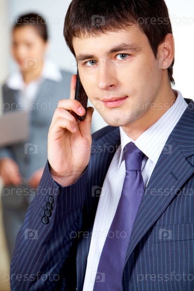 Молодой мужчина в деловом костюме разговаривает по мобильному телефону