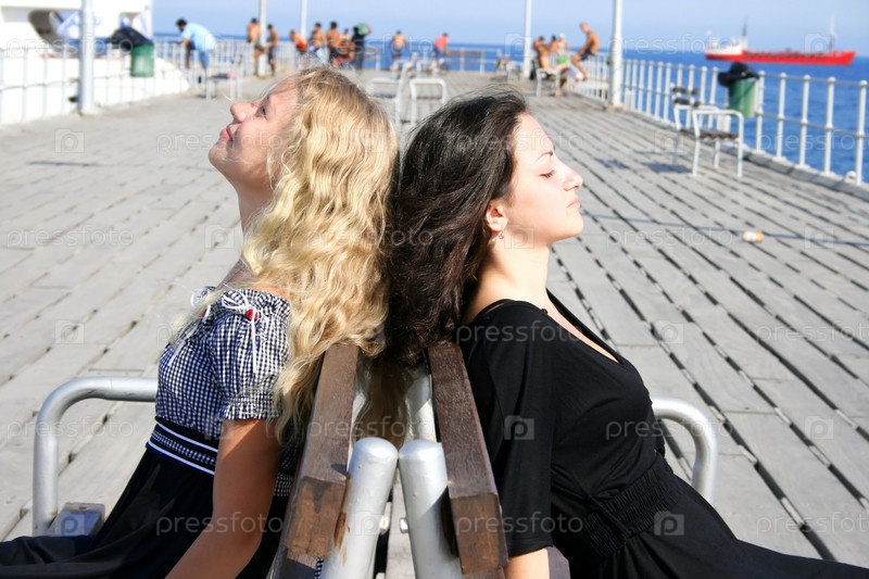 Блондинка и брюнетка сидят на скамейке на пристани