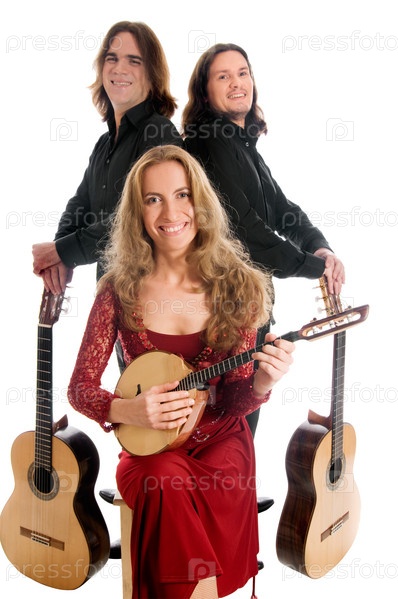 Три испанских музыканта на белом фоне