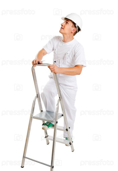 Мужчина на лестнице на белом фоне