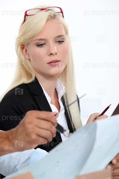 Женщина просматривает документы с коллегой
