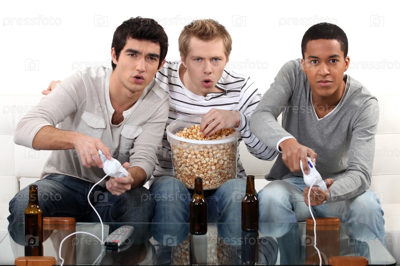 Парни отдыхают с компьютерными играми, пивом и попкорном