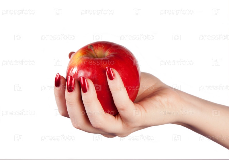 Свежее красное яблоко в руке на белом фоне