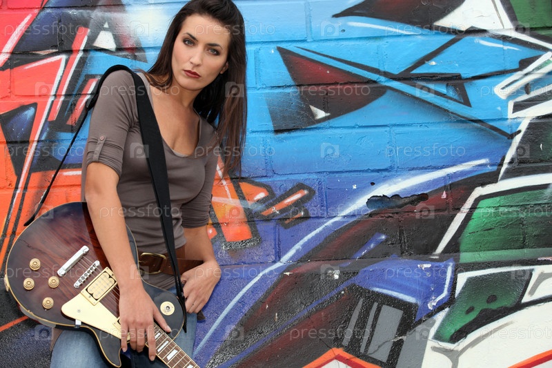 Привлекательная темноволосая певица с гитарой на фоне стены с граффити