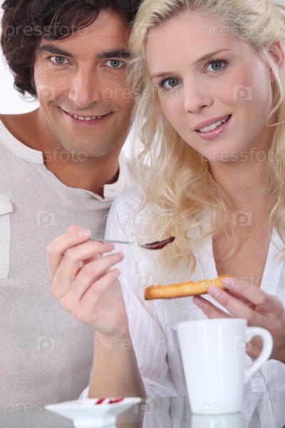 Пара ест тосты с джемом