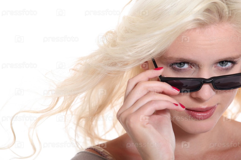 Привлекательная блондинка в солнцезащитных очках в студии