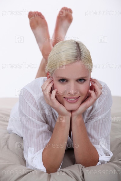 Улыбающаяся молодая женщина лежит на кровати