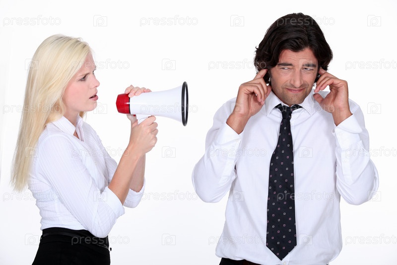 Женщина кричит через мегафон на мужчину. затыкающего уши
