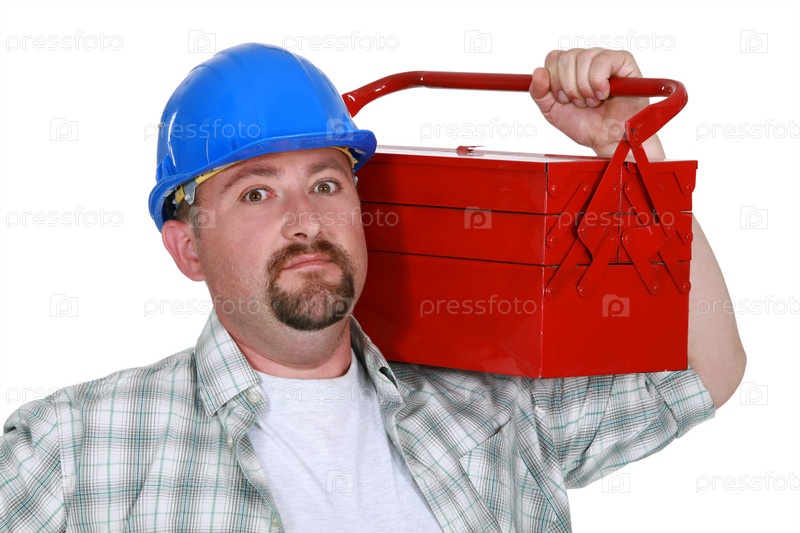 Работник с ящиком инструментов через плечо