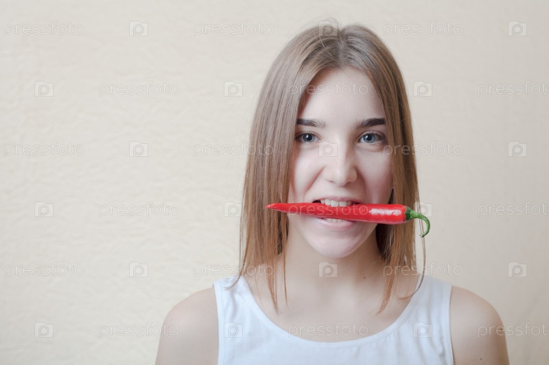 Симпатичная блондинка с острым красным перцем