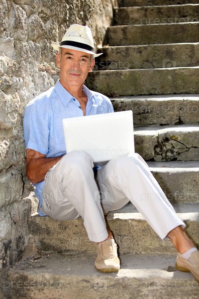 Пожилой мужчина отдыхает с ноутбуком на свежем воздухе