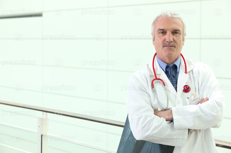 Пожилой врач в больничном коридоре с рентгеновским снимком