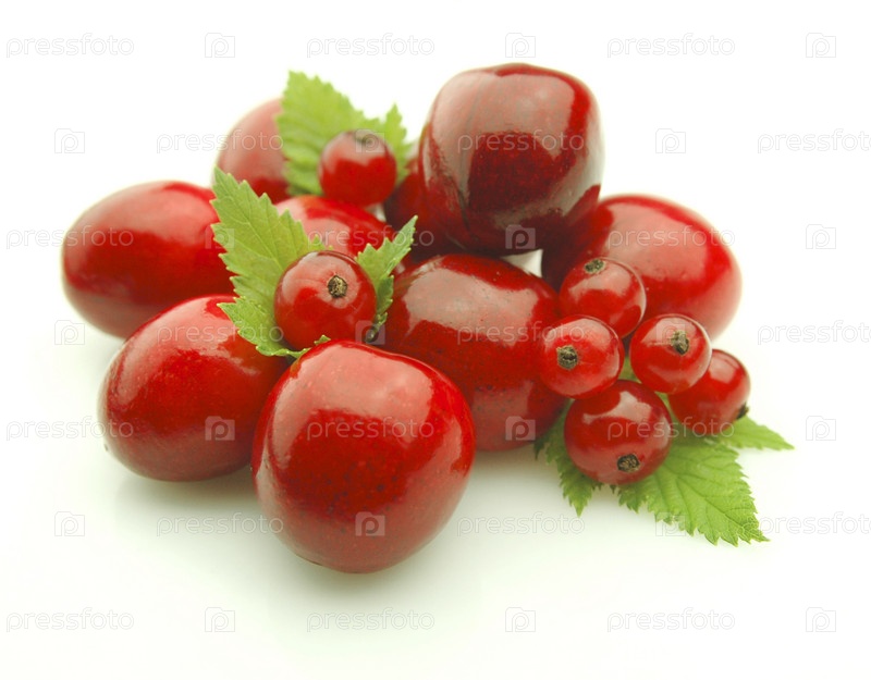 Ягоды вишни и красной смородины на белом фоне