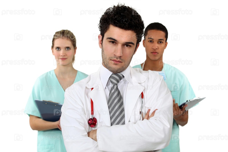 Молодой врач стоит со скрещенными руками на фоне младшего медицинского персонала