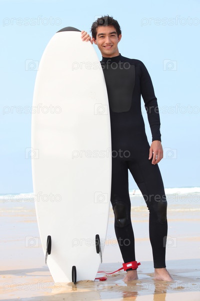 Молодой серфер позирует с доской