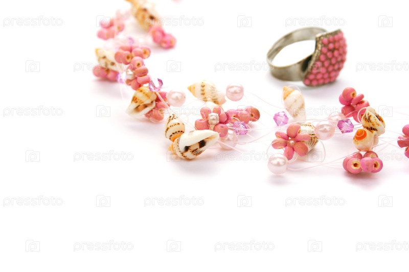 Розовое ожерелье и кольцо на белом фоне
