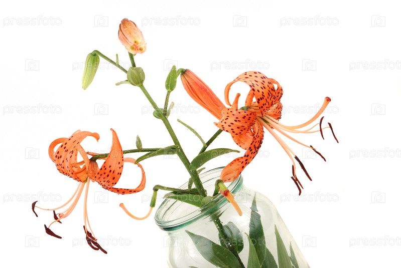 Тигровые лилии в банке на белом фоне
