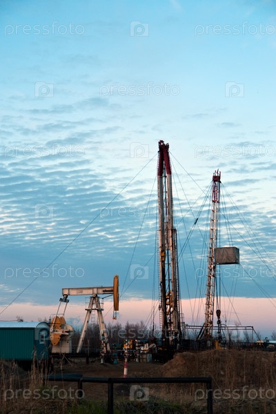 Буровая установка и нефтяной насос на фоне заката. Россия, Западная Сибирь
