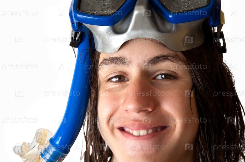 Подросток с длинными мокрыми волосами в маске для дайвинга, изолированный на белом фоне