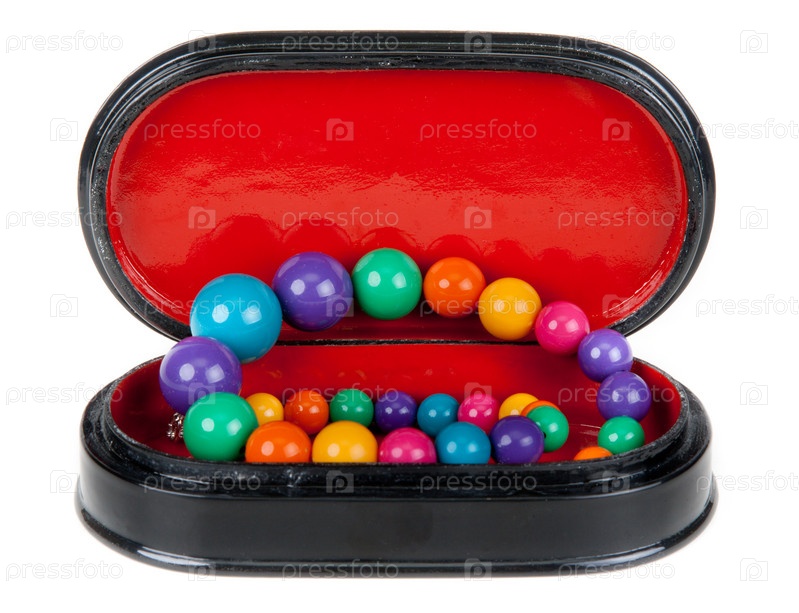 Деревянная коробочка с красной внутренней частью с ожерельем на белом фоне