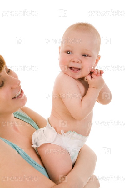 Изображение красивой женщины со своим маленьким ребенком на белом фоне