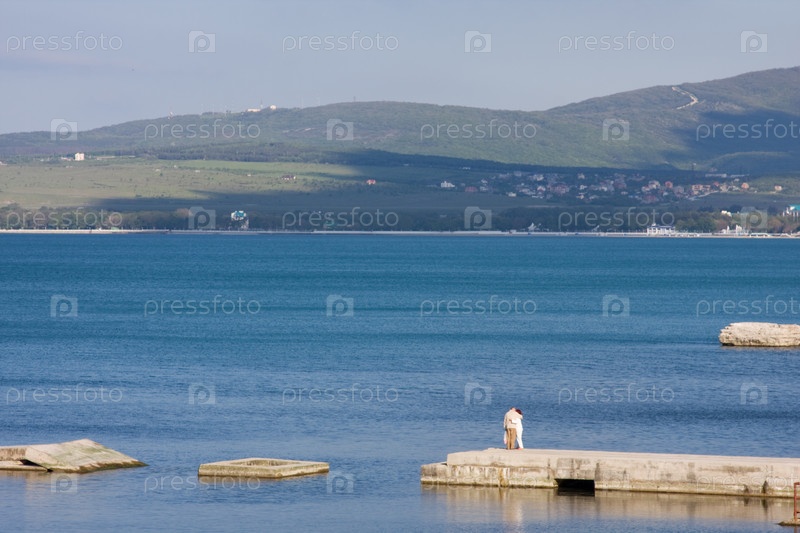 Геленджикская бухта, утро, обнимающаяся пара, стоящая на волнорезе