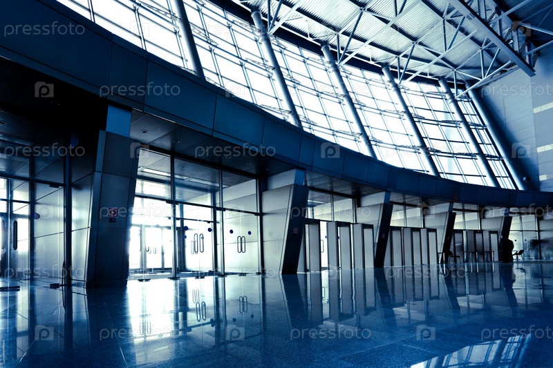 Люди в широком синем цвете выходят из окна зала в экспозиционном центре