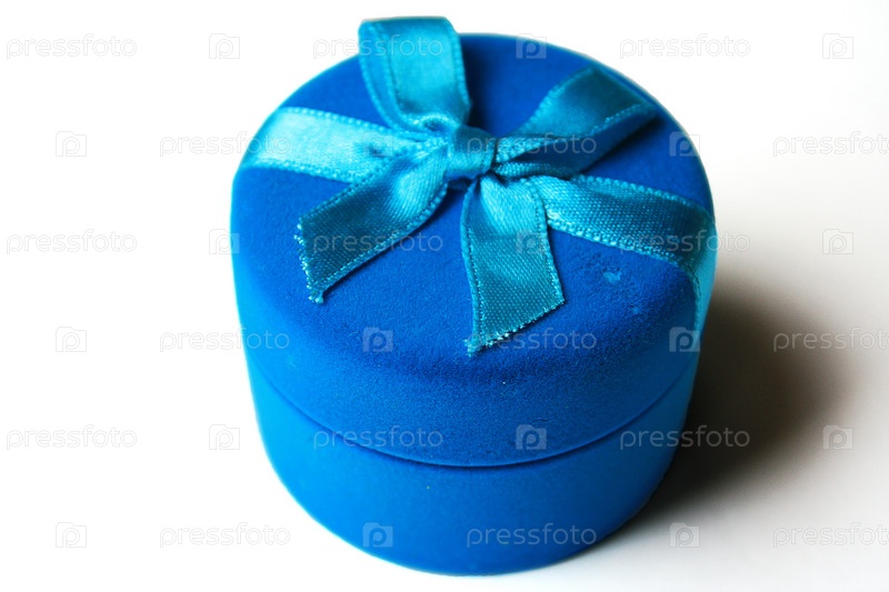 Синяя коробка из бархата с голубой лентой для подарка