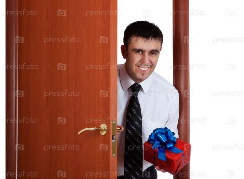 Молодой человек с подарком открывает дверь