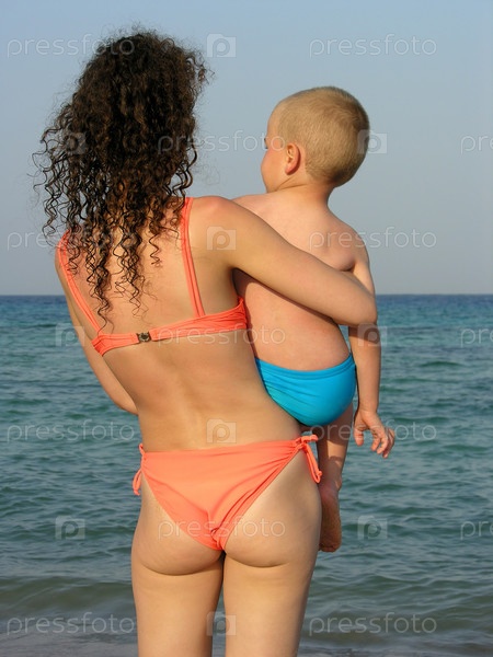 За матерью с сыном на пляже